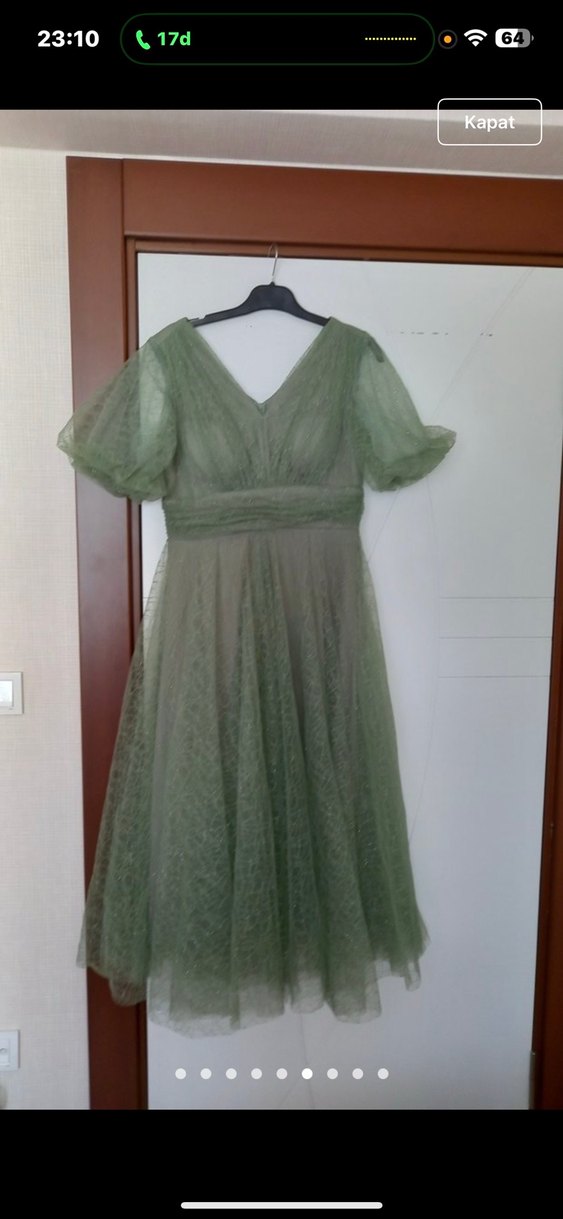 Vintage tarzda, V yakalı ve kısa kollu, drapeli uzun elbise. Gevşek kesim, pastel haki renkte, düğün için uygun. Çok tatlı bir elbise 1 kere giyilmiştir ve kaldırılmıştır alana hayırlı olsun