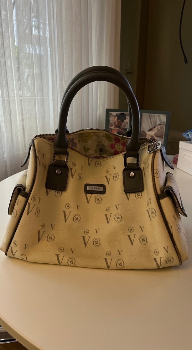 Beyaz deri üzerine baskılı vakko vintage tarzda kadın çanta, tokalı detaylarla klasik zarafet sunar. Günlük kullanıma uygundur.
