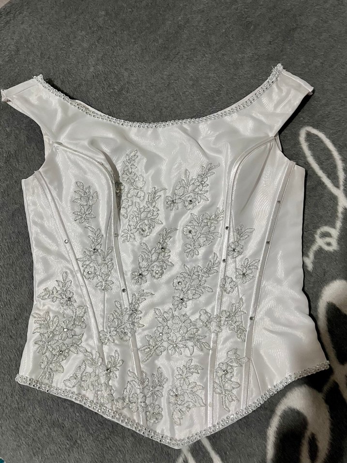 Dantel detaylı, çiçek nakışlı beyaz, straplez ve kolsuz, vücuda oturan vintage tarzda büstiyer. 38 ama 36 ya olur bence ondan 36 işaretliyorum