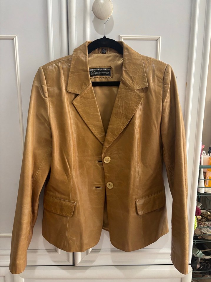 Düğmeli, bej renkte deri kadın ceket. Uzun kollu, normal boyda ve klasik kesimli, parlak görünüme sahip. Ofis kullanımı için uygun.
