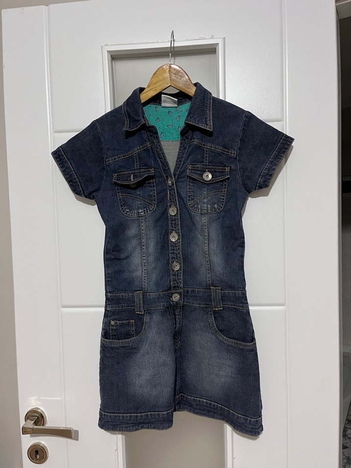Kısa kollu, düğmeli ve fitted kesim kot tulum. Mavi ve gri tonlarda hafif batik desenli, sokak modasına uygun.
