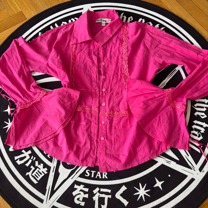 Vintage coquette gömlek. Dantelli, çan kollu rengi parlak bir pembe. Thrift shoptan alındı, kondisyonu çok iyi durumda. Koleksiyonluk ♀️