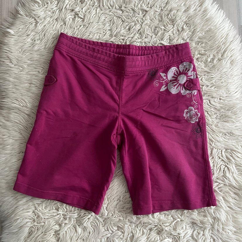 Koyu pembe renkli, çiçek desenli ve kemerli kız çocuk şortu, yumuşak sentetik kumaştan, sokak modasına uygun.