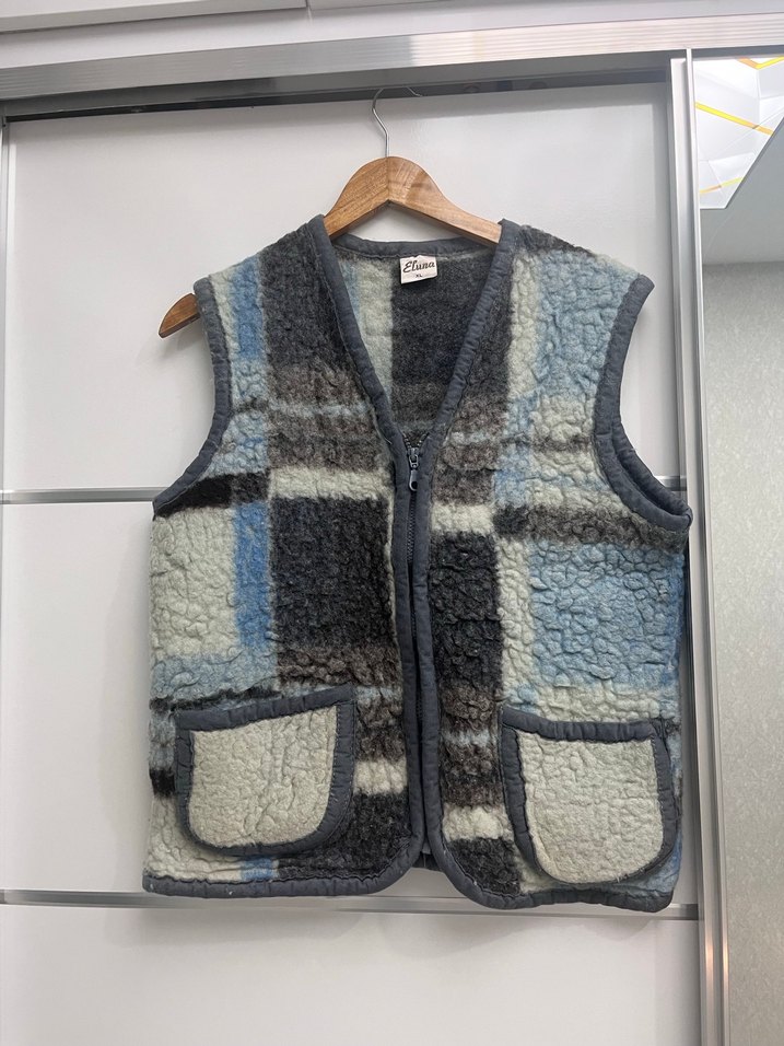 Gri tonlarında bağcıklı desenli, triko dokulu, normal uzunlukta, rahat kesim ve bisiklet yaka kolsuz kadın yelek. Önünde iki cep ve fermuar vardır.