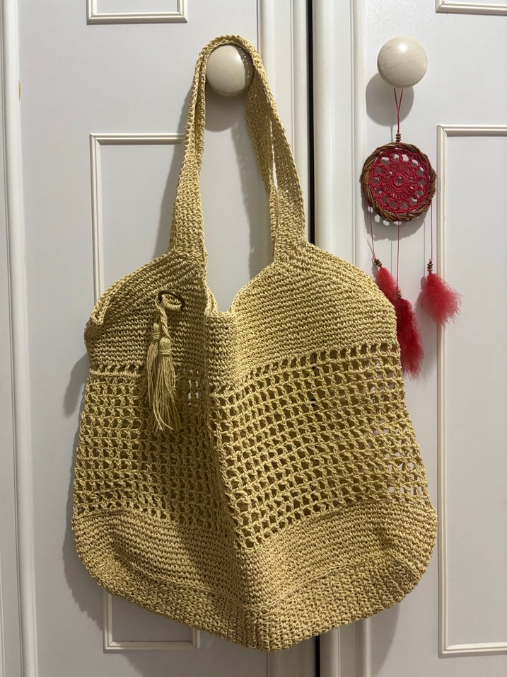 Sarı renkli, bohem tarzda örgü kadın çanta, püskül detayıyla dikkat çekiyor. Desensiz ve geniş yapısıyla günlük kullanıma uygun.