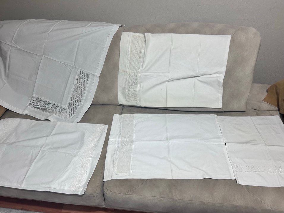 Vintage 35 yıllık çeyizlik aynı nakışta 3 takım. 1 adet kare bohça 2 adet yastık kılıfı farklı nakışlı bir adet daha yastık kılıfı farklı nakışta bebek yastık kılıfı.Bir adet yastık kılıfında sandıkta durmaktan sararma mevcuttur leke çıkarıcı uygulamadım uygulanırsa çıkar diye düşünüyorum.