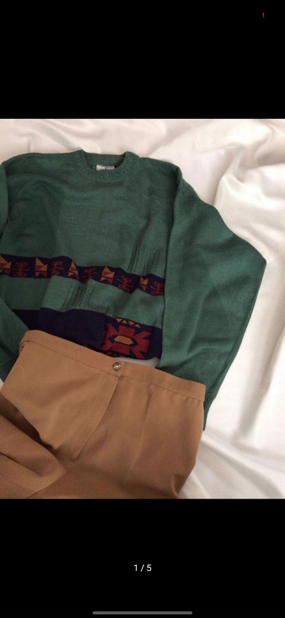 Unisex, yeşil, örgü yünden yapılmış, uzun kollu, bisiklet yaka, normal boyda, salaş kesim kazak. Bel kısmında ince desenli bant bulunur, günlük kullanıma uygundur.