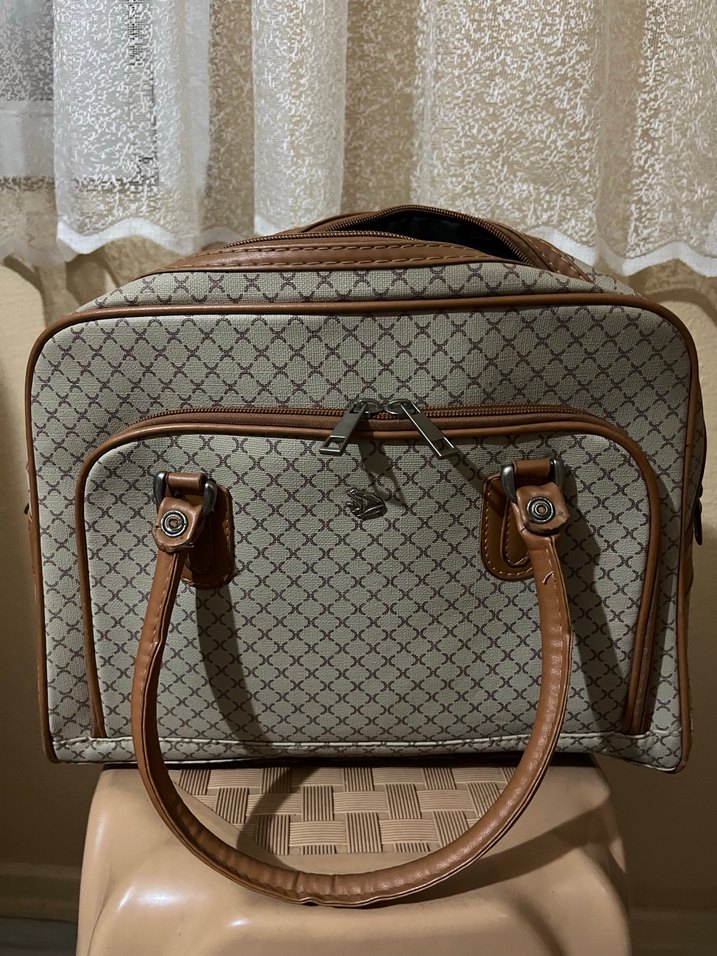 Kahverengi saplı, yılan desenli deri iş çantasıdır. Vintage tarzda, fermuarlı ve günlük kullanıma uygundur.