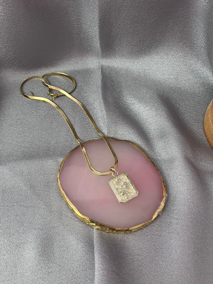 Uzun altın kolye, detaylı zincir ve pastel tonlarda vintage yılan desenli uç ile günlük kullanıma uygundur.