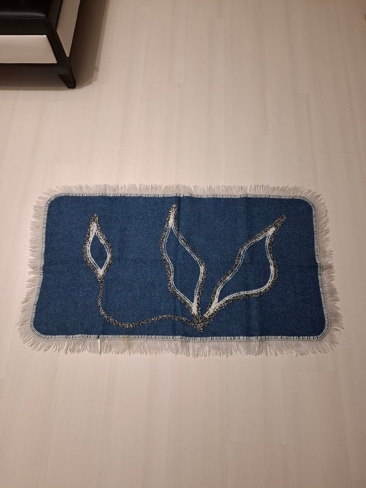 #Vintage eskilerden #petrolmavisi renginde üzerindeki desenleri punch işi gibi,ince ama #yünlü ,kenarları püsküllü #kilim #paspas Kenar püsküllerinin orda sarımtrak bi leke olmuş ve onun yakınındaki bi püskülü de çıkmış ama çok dikkat çekici değiller,parmaklada gösterdim.Haricinde tertemiz,bunca yıla göre çok iyi kondisyonda,yıpranmamış,sağlam,sorunsuz üründür.Fotoda ölçüleri de mevcuttur.