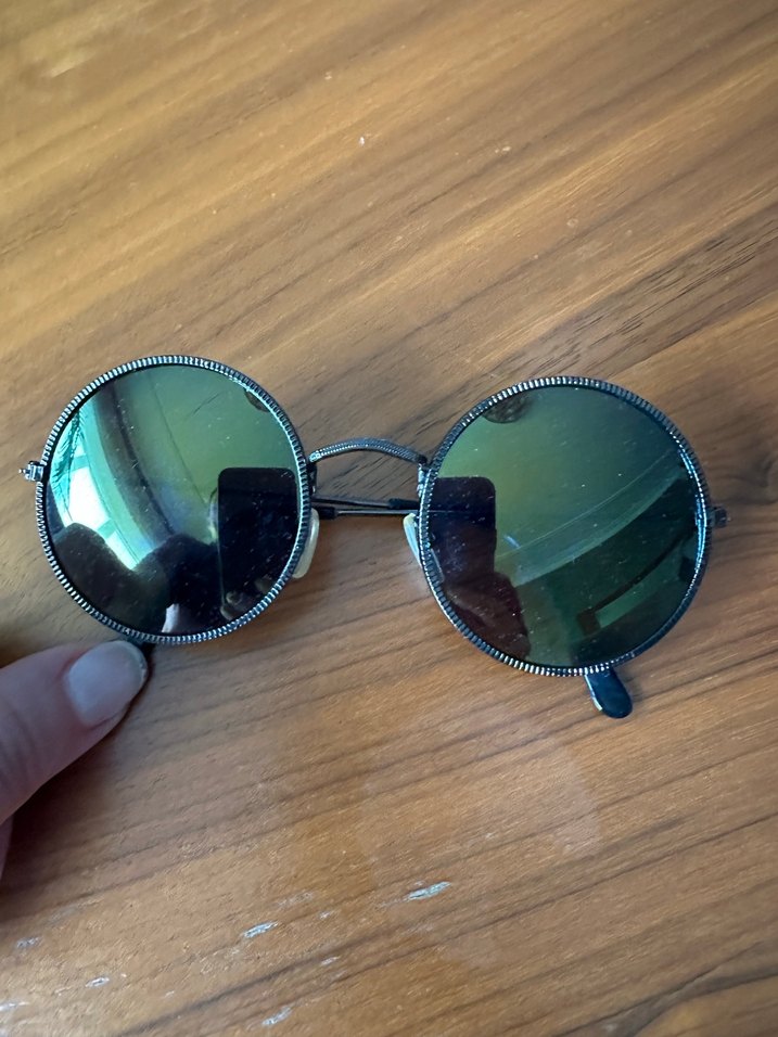 Yuvarlak şekilli, parlak yeşil vintage gözlükler, tokalı detaylarla bohem ve retro tarz için uygun.