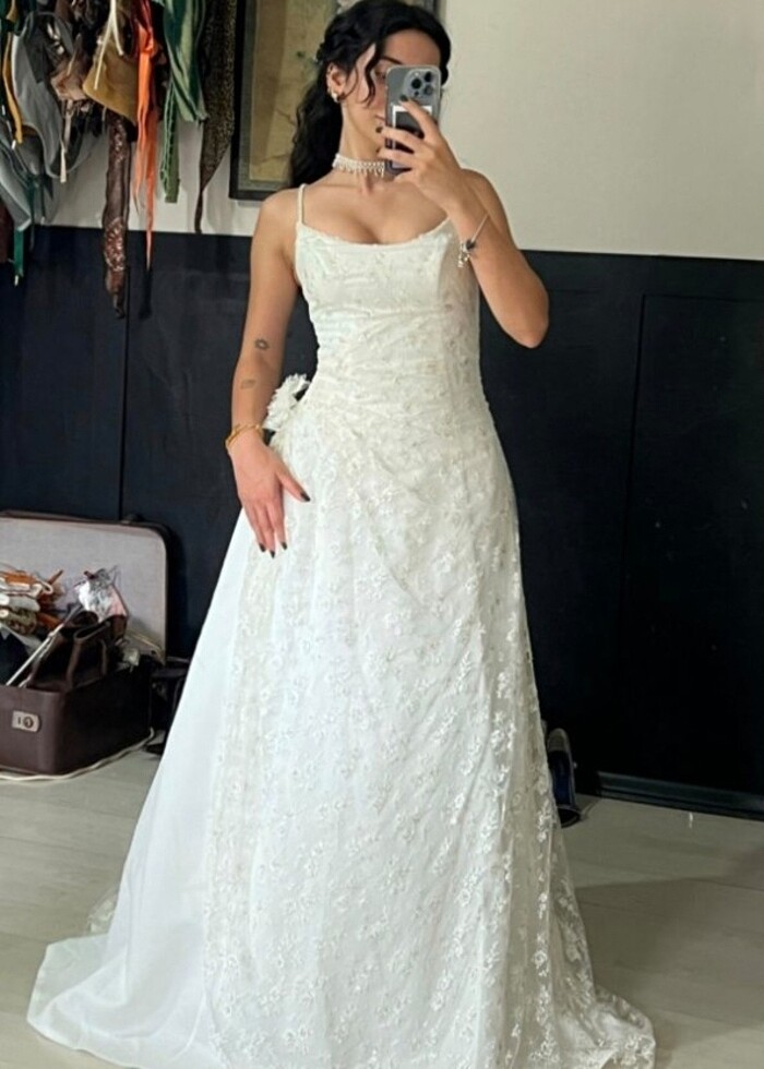 Vintage zarif gelinlik dantel, boncuk ve pul işlemeli sorunu yoktur, kuru temizlemesi yapıldı. Modelin boyu 1,53 kilo42 #petite