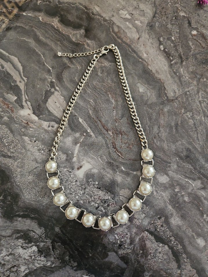 Zincir detaylı, beyaz inci görünümlü boncuklarla süslenmiş vintage ve gotik tarzda kadın kolyesi, günlük kullanıma uygundur.