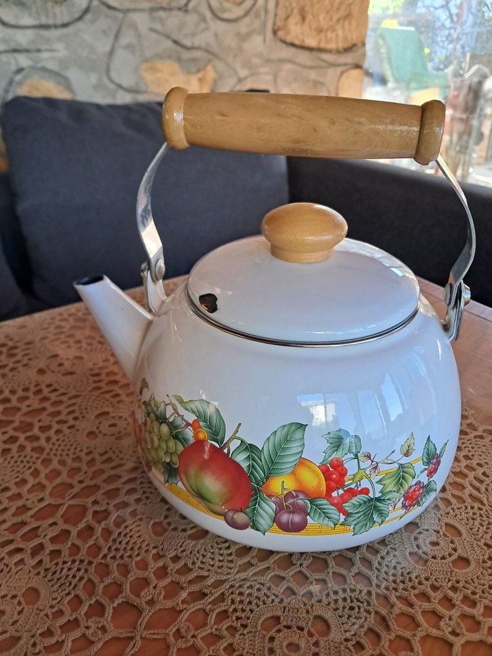 Renkli meyve desenleri ve ahşap sapı olan beyaz çaydanlık. Klasik şekil ile canlı dekorasyonu bir arada sunar. Markalı,temiz,az kullanılmıştır.1990lı yıllara ait.Tam bir tavan arası ürünü,gerçek vintage.Sapta ve kapaktaki atık dışında,kusursuzdur.