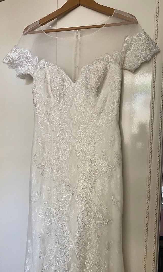 Dantel işlemeli, V yakalı ve kısa kollu, modern klasik ve vintage tarzda beyaz prenses gelinlik