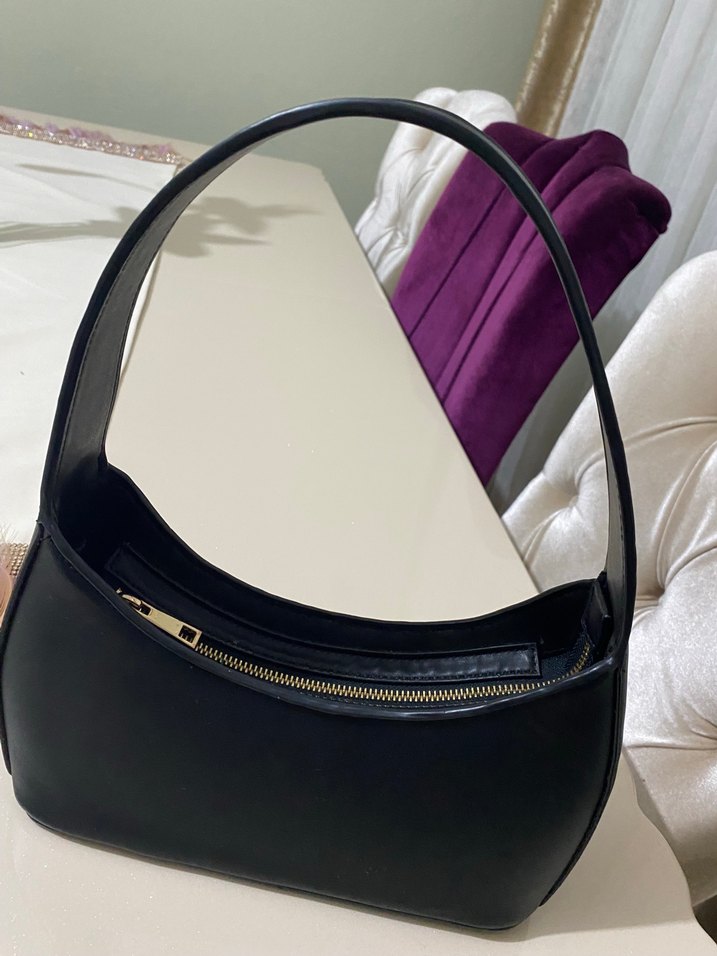 Siyah deri, fermuarlı kadın çanta, desen içermeyen şık tasarımı ile klasik sokak tarzına uygundur.