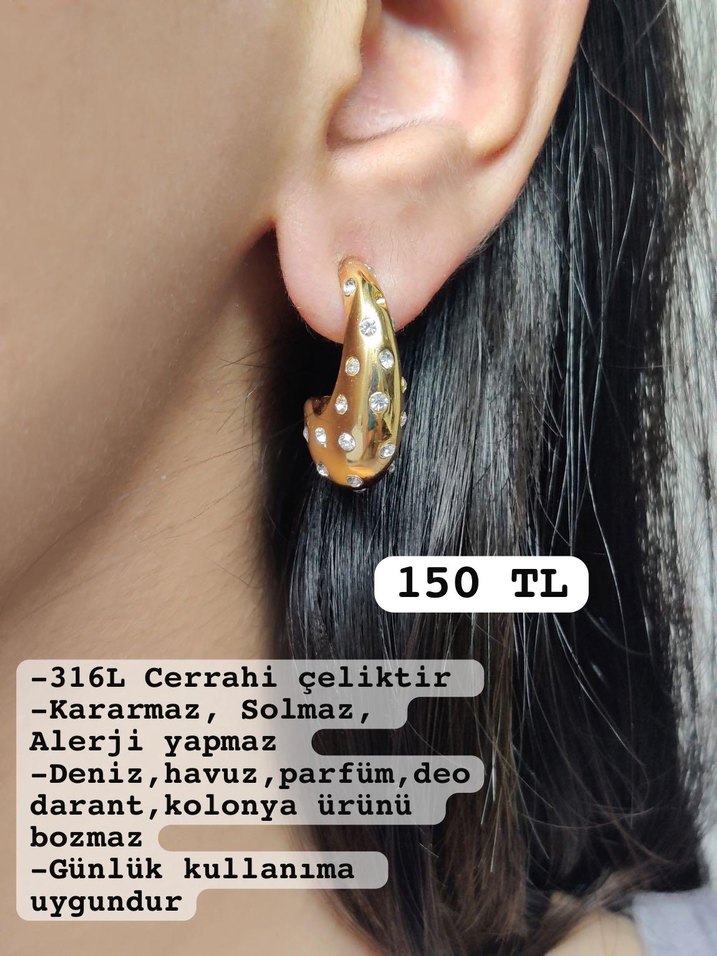 Zirkon taş detaylı, damla desenli altın renk mini küpeler. 316L cerrahi çelikten, kararmaz, solmaz ve alerji yapmaz. Günlük kullanıma uygundur.