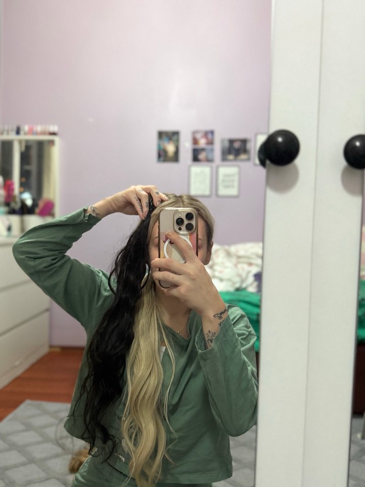 Uzun dalgalı siyah ve sarı renklerde doğal görünümlü peruk, kolay takılır ve şekillendirilir.