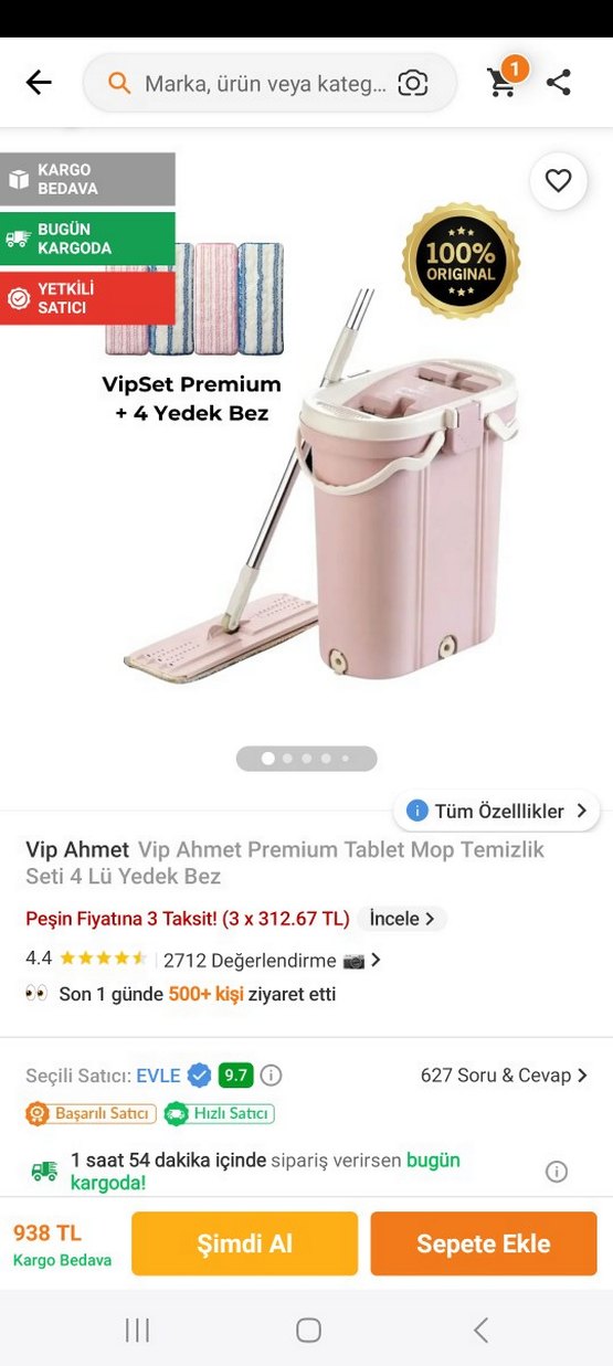 Vip Ahmet Premium Tablet Mop temizlik seti, pastel pembe renk, dört yedek bez ve taşıma kolaylığı sağlayan tekerlekli kova içerir.piyasa fiyatı 940 lira hiç kullanılmadı