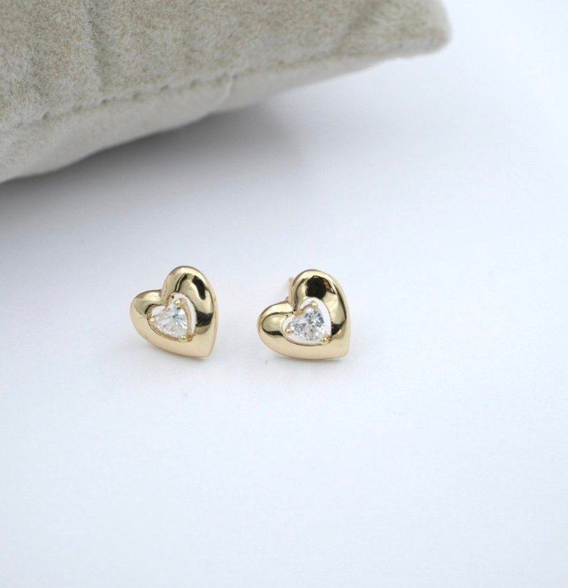Altın renkli, mini kalp şeklinde, ortasında küçük parlak taş bulunan küpeler, romantik akşamlar için uygun.