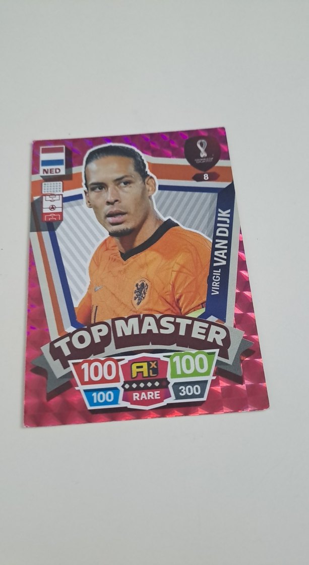 Athleisure tarzında, koyu kırmızı renkte Virgil Van Dijk futbol temalı pop kültür rozeti. Üzerinde 'Top Master' ve '100, 300, RARE' yazıları yer alır. ⚽