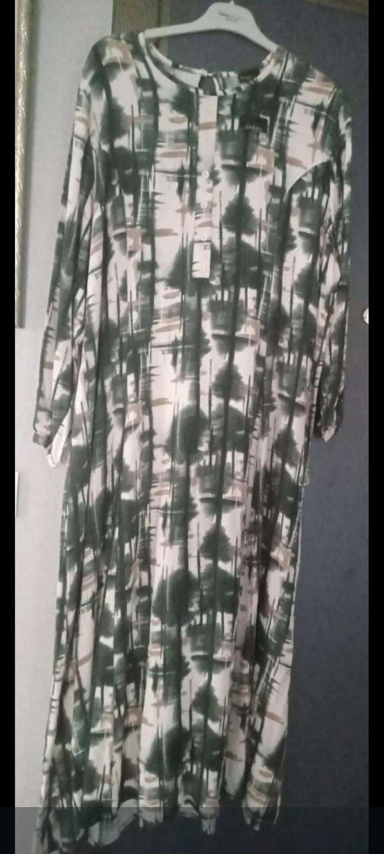 Kısa kollu, kayık yaka, piliseli, bol kesim uzun elbise. Bohem tarzda, haki batik desenli, sokak stiline uygun.