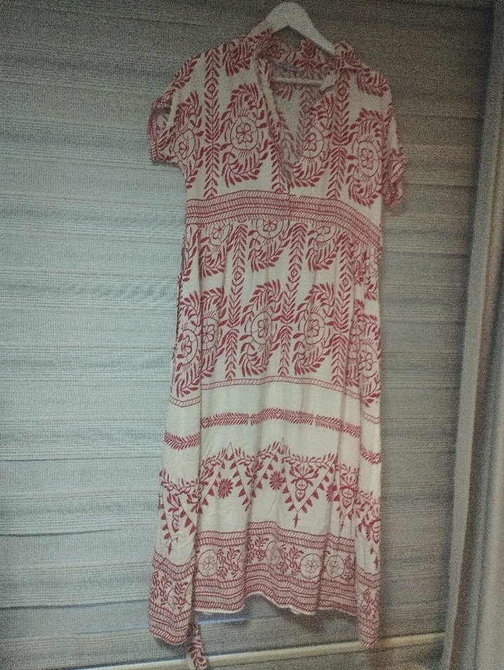 yumuşacık pamuklu viskon kırmızı desenlere sahip, kısa kollu ve V yakalı, bol kesim uzun bohem elbisedir. Günlük kullanım için rahat ve dökümlü bir stildir.