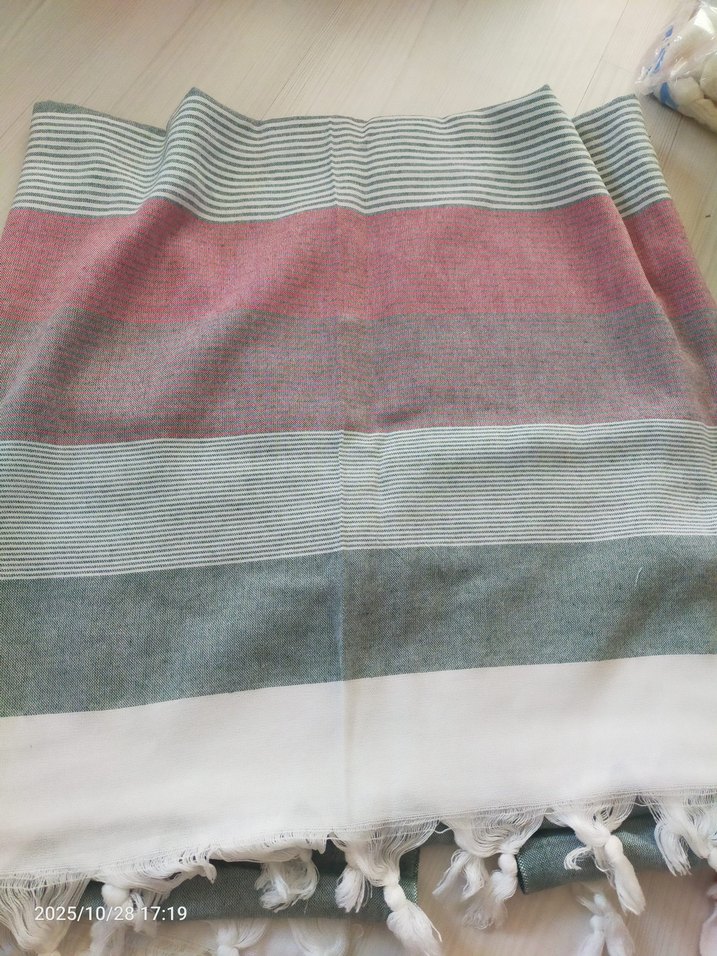 yumuşak pamuklu kumaştan yapılmış, püsküllü kenarları olan peştemal.