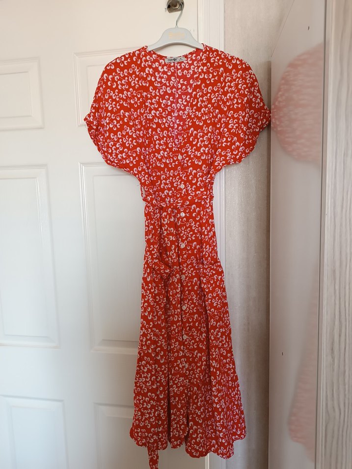 Kırmızı, V yakalı ve kısa kollu uzun elbise, bol kesim ve drapeli detaylara sahiptir. Canlı tie-dye desenlidir, günlük kullanıma uygundur. önü düğmeli, temiz bir kez kullanılmıştır.kuşaklı.
