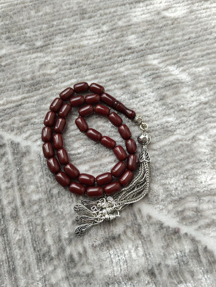 Visne renkli orijinal Sıkma Kehribar, eski döküm olup yeni sentetik malzeme değildir, 7*10 mm ölçülerinde, gümüş kaplama kararma yapmaz püskül, el boy olup yağ gibi çekimi var, alana hayırlı olsun