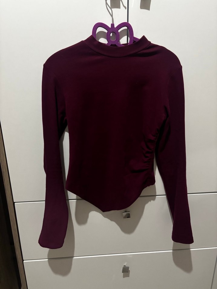 yüksek yakalı ve uzun kollu dar kesim kadın bluz. 2 kere giydim ambar L