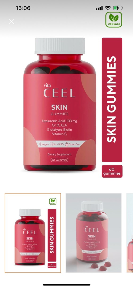 Vita Ceel Cilt Sakızları 100 mg hyaluronik asit, Q10, ALA, glutatyon, biotin ve C vitamini içerir. 60 sakızlı, vegan ve glutensiz takviye üründür.