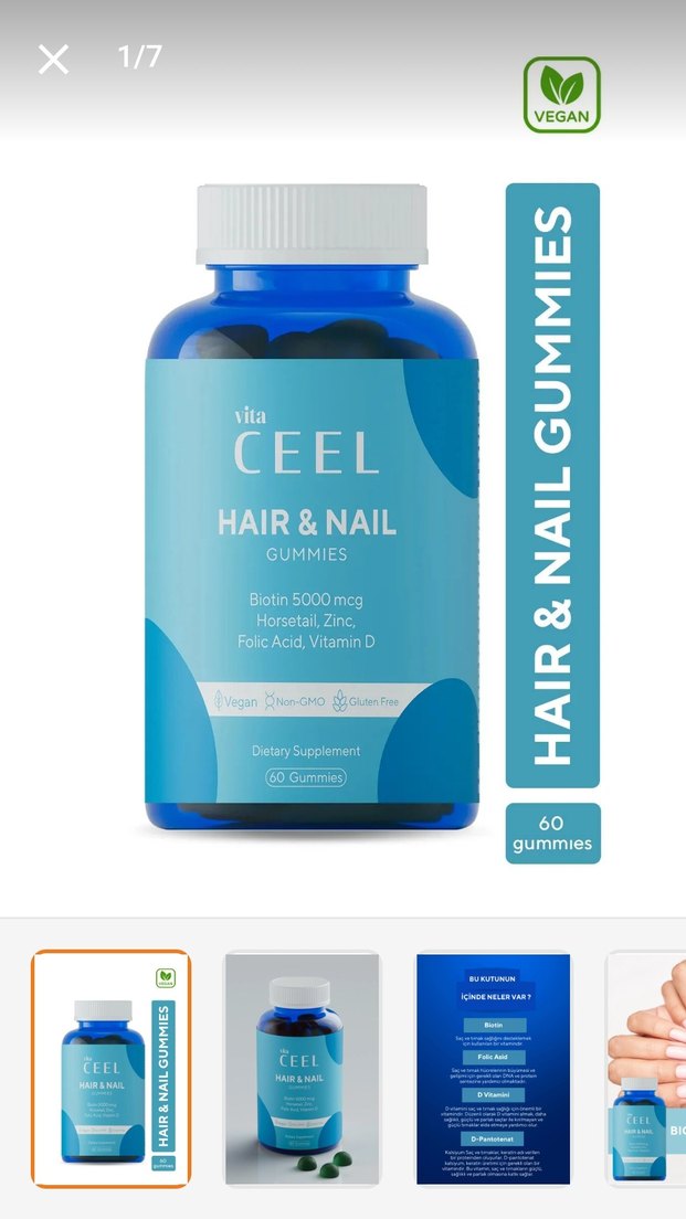 Vita CEEL Saç ve Tırnak gummies, biotin 5000 mcg, at kuyruğu, çinko, folik asit ve D vitamini içerir. Saç ve tırnak sağlığını destekler. Vegan ve glutensiz.