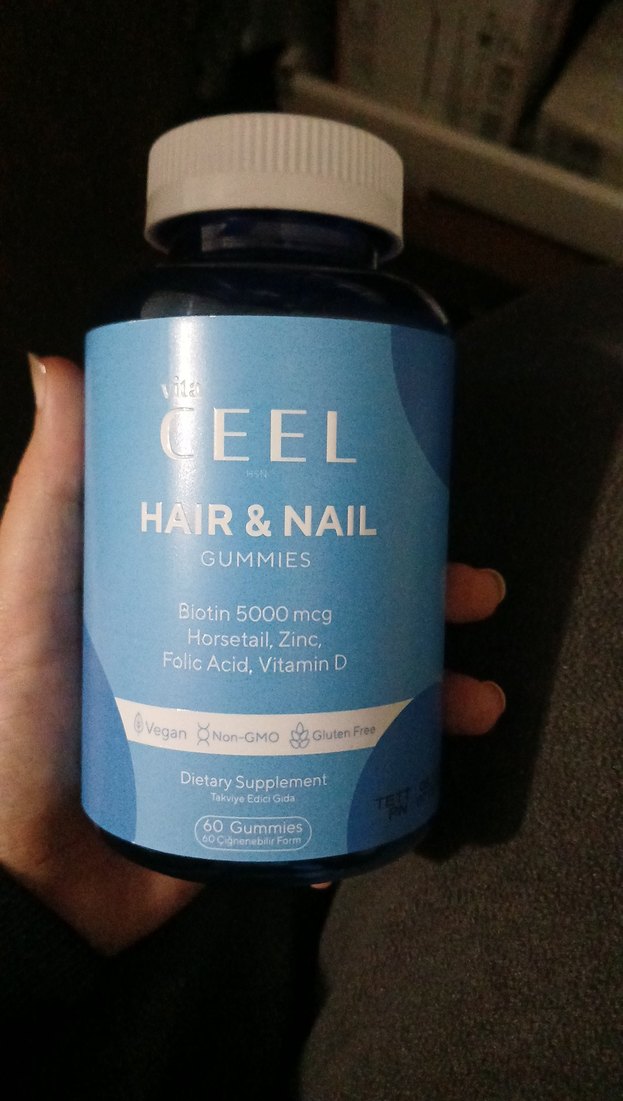 Vita Ceel Saç ve Tırnak gummies, 5000 mcg biotin, at kuyruğu, çinko, folik asit ve vitamin D içerir. Vegan, GDO'suz ve glutensiz 60 çiğnenebilir takviye içerir.