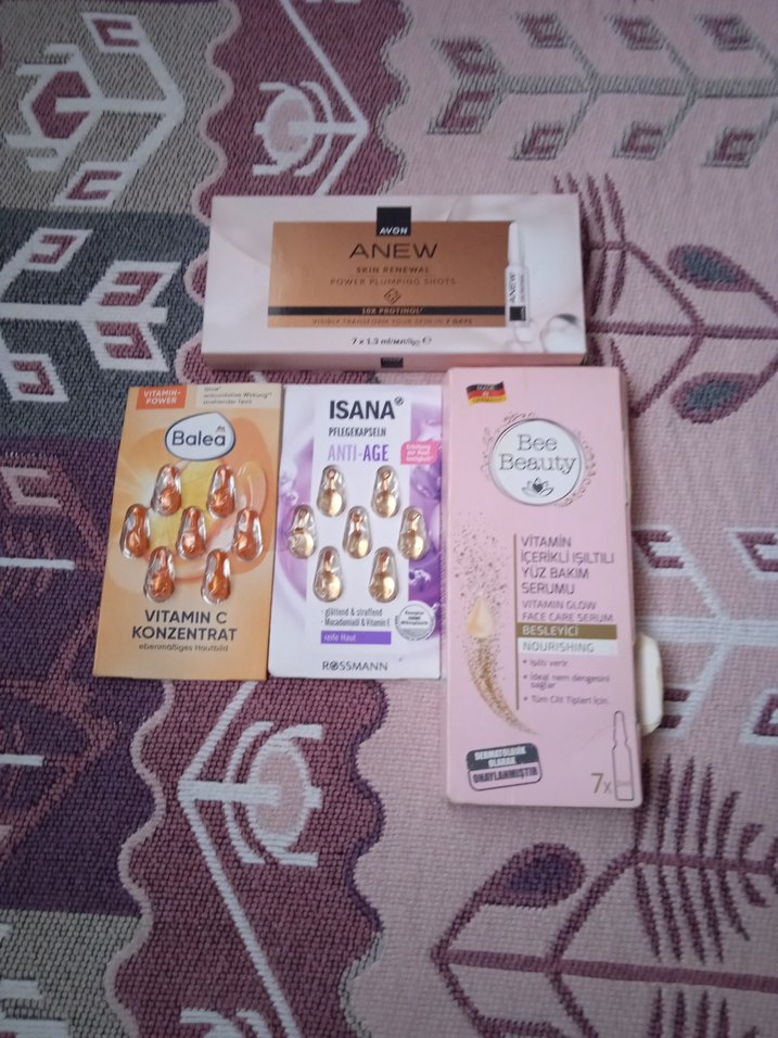 Anew anti-age, Balea vitamin C konsantre ve Isana anti-age kapsülleri içeren besleyici yüz serumu seti. Sadece son resimdeki den iki adet kullanılmıştır