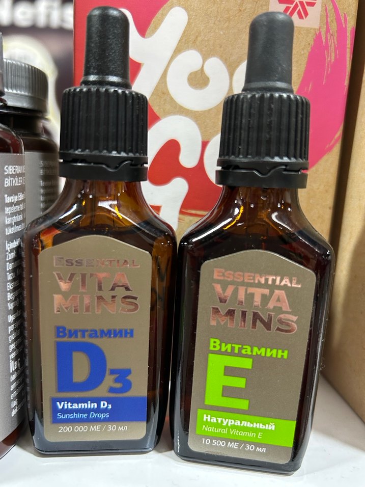 Essential Vitamin D3 ve E serumları, doğal E vitamini ve güneş ışığı damlaları içerir, 30 ml şişede sunulur.