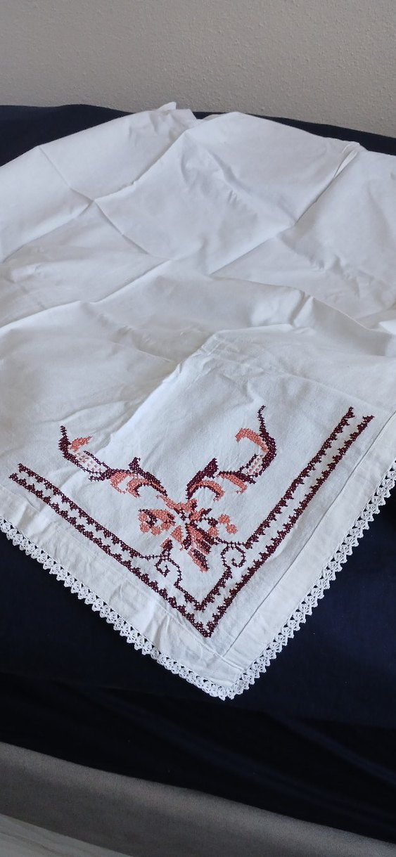 Bu beyaz masa örtüsü, çiçek desenli geleneksel nakış ve zarif dantel kenarlarla klasik bir görünüm sunar. ️