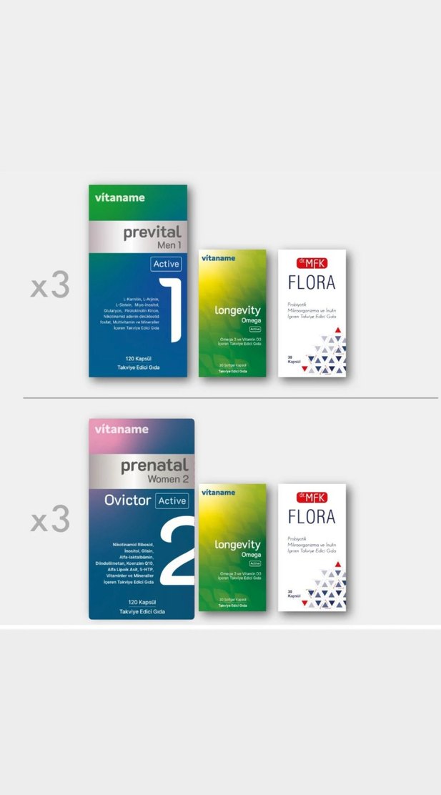 Erkek ve kadınlar için 120 kapsüllük Prevital Men 1 ve Prenatal Women 2 vitaminleri, Longevity Omega takviyesi ve Flora probiyotik ürünleri içeren set.
