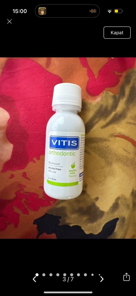 VITIS ortodontik, günlük kullanım için elma nane aromalı, alkolsüz ağız gargarasıdır. Hassas ağızlar için uygundur.