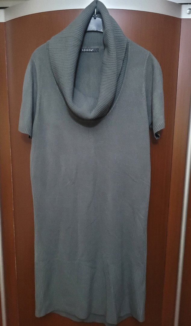 #vitrin marka l beden füme rengi düşük boğazlı mini elbise yada tunik isteğe göre kullanılır kısa kollu görselde göründüğü gibidir ince triko gibi kışlık