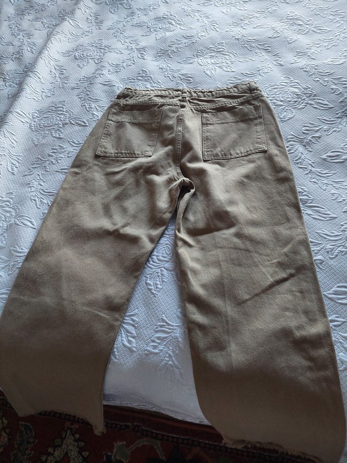 Bej renkte, bol kesim ve keten kadın pantolon. Rahat kesimi ve büyük arka cepleriyle gündelik kullanıma uygundur.