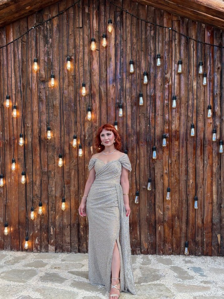 Vizon ve gri tonlarda leopar desenli, drapeli ve straplez uzun abiye elbise. Bohem tarzda, klasik zarafeti yansıtır, düğünler için uygundur.