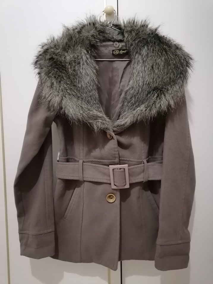 Vizon renkte, kürklü yakası ve kemerli beli olan, uzun kollu, midi boy, yumuşak kumaşlı kadın kaban. Ofis için uygun şık tasarım.