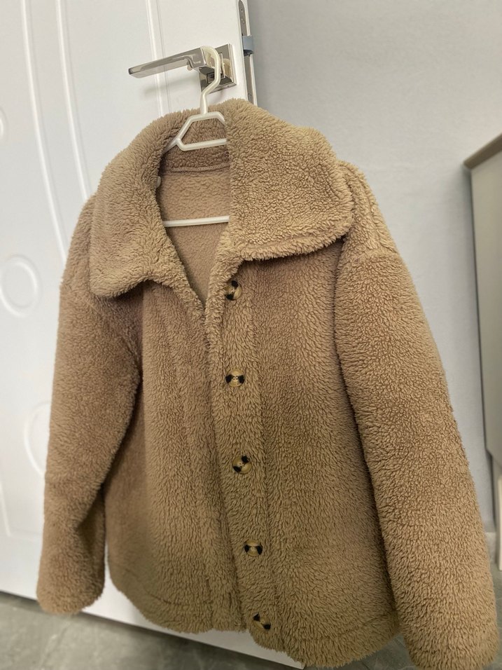 Vizon renkli, peluş detaylı, geniş kesim, uzun kollu, normal midi uzunlukta kadın mont. Rahat ve sıcak tutan kumaştan yapılmıştır.
