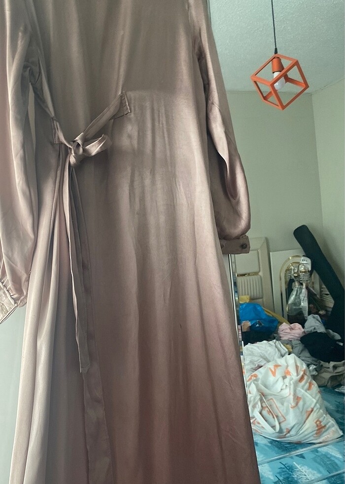 Yan ve ortasında kuşak vardır sütlü kahve renginde hafif parlak satendir 38 40 bedene olur yaklaşık 69 kilo 1..60 boyda giyilmiş boyu 140 cm iki koltuk arası ölçüsü arka ve ön toplam 80 cm yandan bağlanılıyor bir defa giyildi