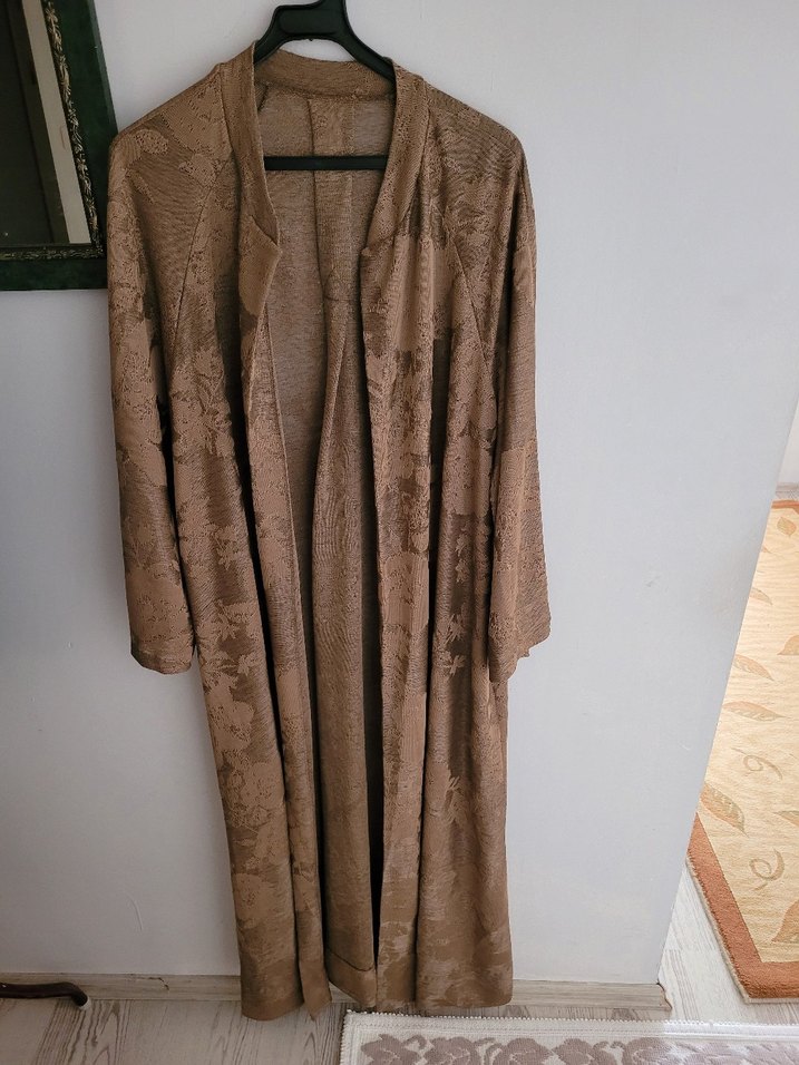 Bej renkli, uzun kollu, bol kesim kadın sabahlık. Yumuşak dokulu kumaştan, bohem tarzında ve uzun boyda rahat bir model.