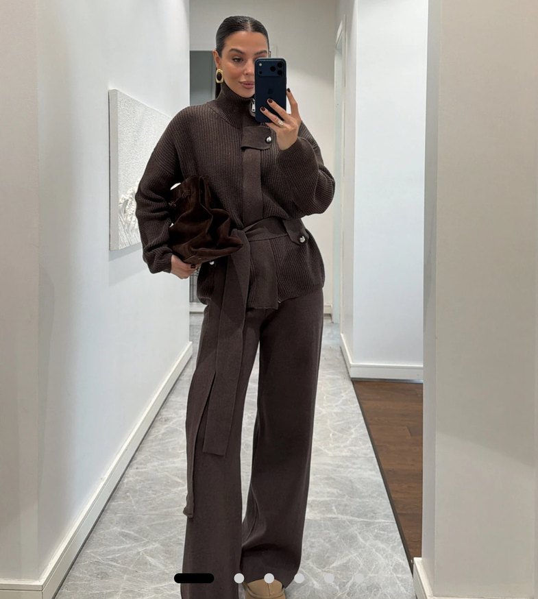 Yumuşak ve sıcak dokulu vizon takım, yüksek yakalı ve uzun kolludur. Kemer detaylı standart bedendir