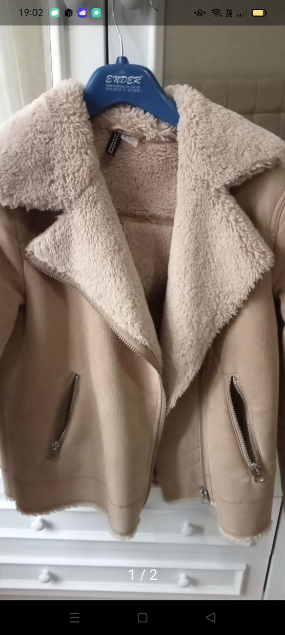 Vizon renkte, süet kumaştan yapılmış, uzun kollu ve kürklü detaylı kadın ceket. Günlük kullanım için uygun, fermuarlı cepleri ve kesimli yakası bulunur.