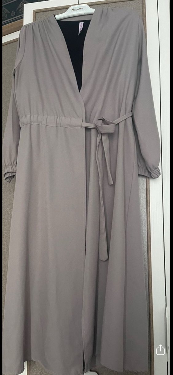 Vizon renkte, uzun kollu ve salaş kesim, notched lapel yakalı uzun elbise. Drapeli tasarım ve bağlamalı kemer detayına sahip, yumuşak sentetik kumaştan üretilmiştir.