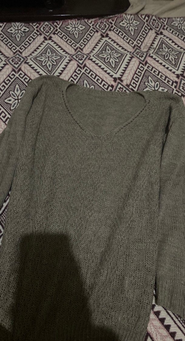 Vizon renkli, V yakalı, uzun kollu kadın triko kazak. Rahat kalıp ve normal boyda, bohem tarzıyla günlük kullanıma uygun.